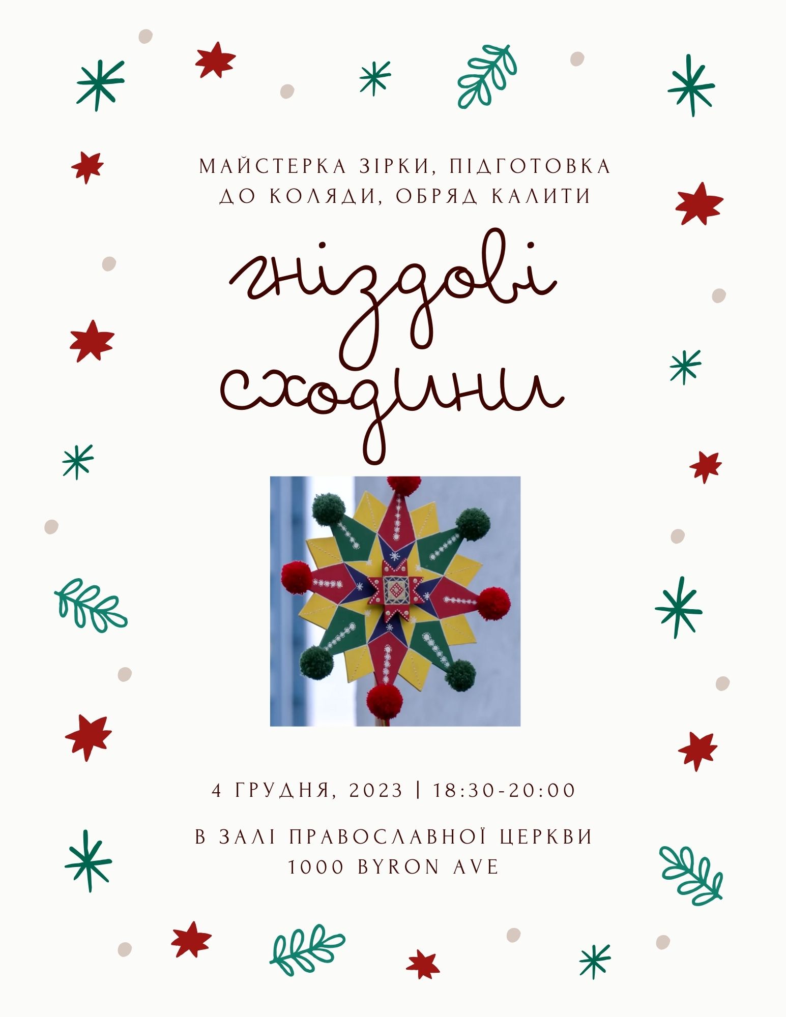 Заля української православної церкви 1000 Byron Ave, Ottawa, ON, CanadaПредставлення лялькового театру, майстерка різдвяної зірки, ігри, підготовка до коляди, участь в обряді Калити. Просимо одягнути хустку й принести сорочинку/фартух щоб не поплямити одяг фарбою. Останні сходини перед різдвяною перервою.
